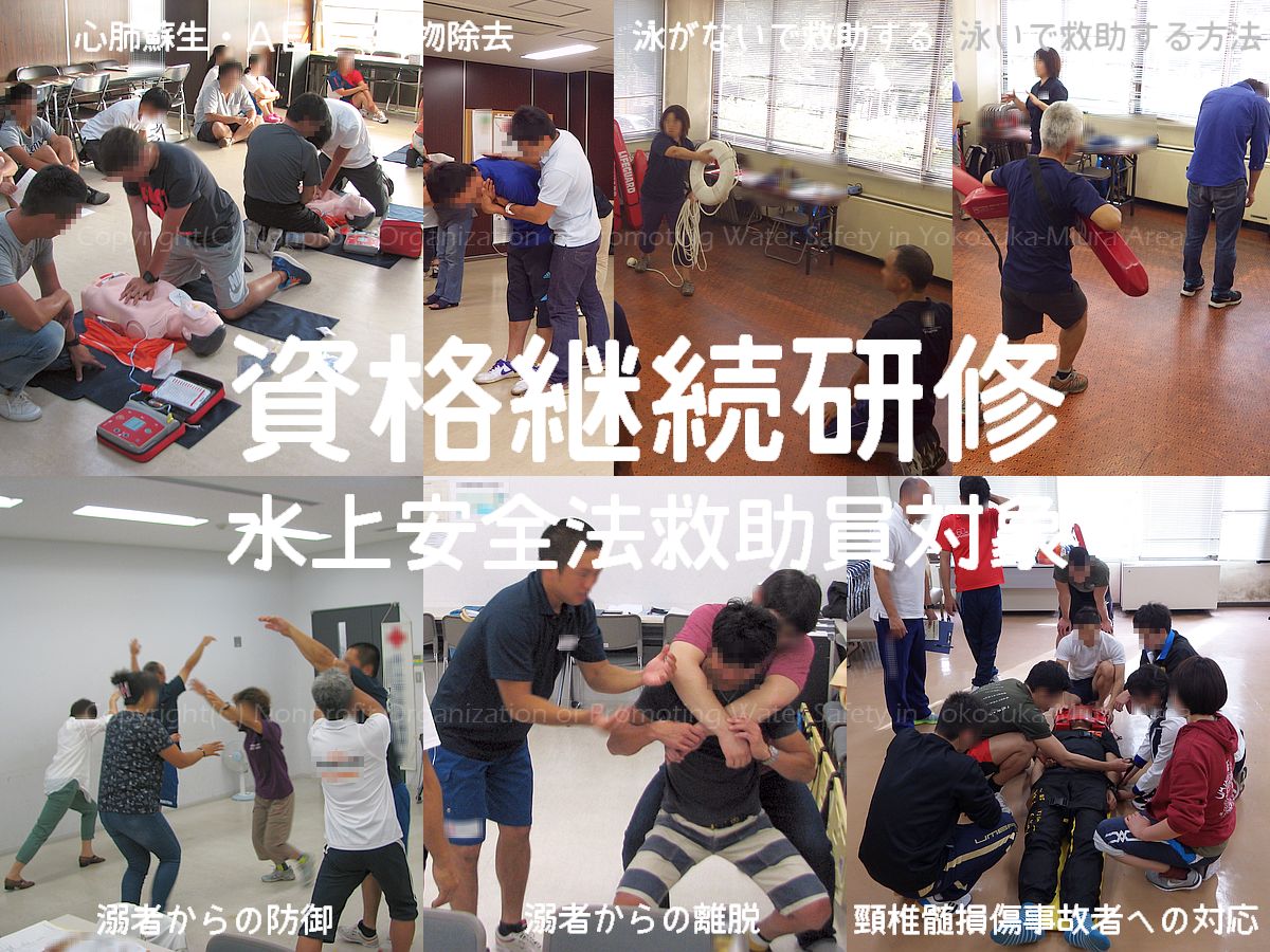 水上安全法救助員対象の資格継続研修は、2019年3月末をもって廃止されました。有効期限以降も水上安全法救助員の資格を維持されたい場合は、救急法基礎から水上安全法救助員養成講習への再受講が必要です。