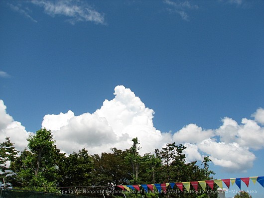 写真は、プール講習の会場から写した夏の入道雲。雲の白と空の青のコントラストが印象的です。