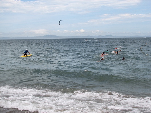 写真は、ウォーミングアップのため、沖へ向かって泳いでいる様子。対岸には房総半島が見えます。