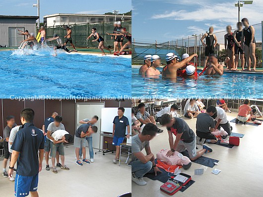 心肺蘇生、AED使用法、気道内異物除去などに加え、水の事故の予防、水の中での自分を守る方法、救助のための泳ぎ方、事故者の救助方法、応急手当などを習得し、「水上安全法救助員1」と「救急法基礎講習修了者」の2つ資格の同時取得を目指す。