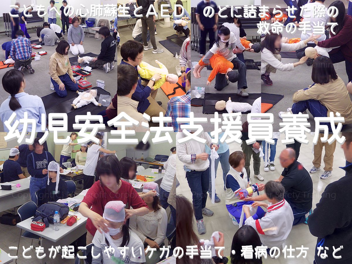 こどもの事故の予防、応急と救命の手当、病気への対応を習得する幼児安全法支援員養成講習を受講し、赤十字幼児安全法支援員の資格取得を目指すコース。